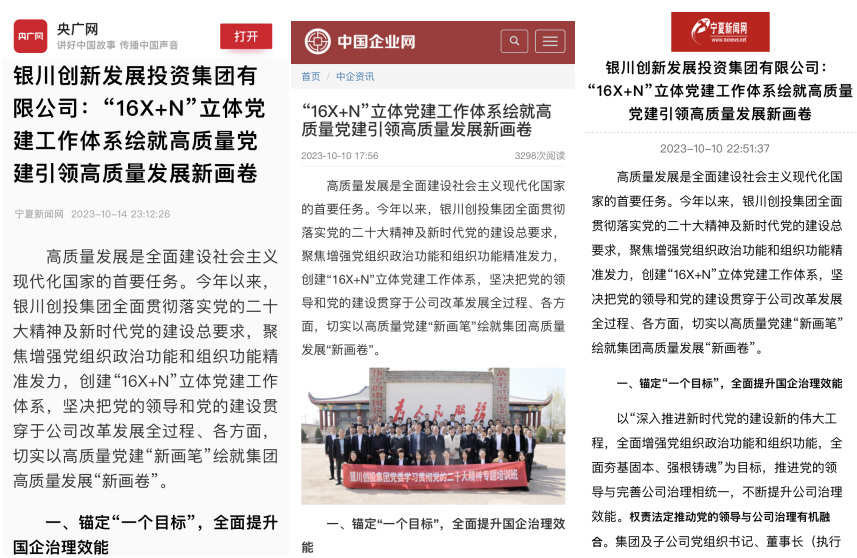 近日,央廣網(wǎng)、中國企業(yè)網(wǎng)、寧夏新聞網(wǎng)等主流媒體聚焦國企高質(zhì)量發(fā)展的生動實踐,深度報道了銀川創(chuàng)投集團黨的建設(shè)成果。